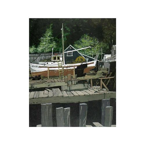 [Canadian 1939-1999] UNTITLED (BOATS AT DOCK) Oil on board 28 x 22 in. Signed.