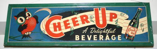 Tin advertising sign promoting Cheer Up A Delightful Beverage. Stout Sign Company, St. Louis. Measures approximately 47" x 15". Minor paint chips around edges.