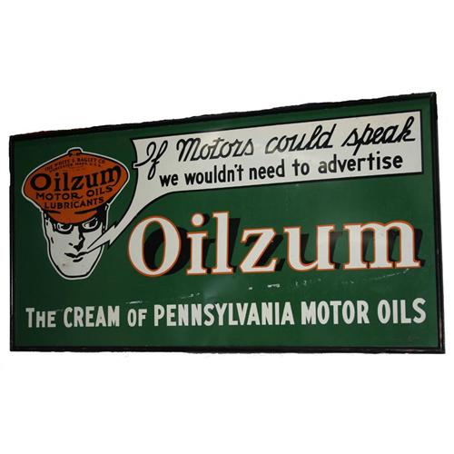 Advertising Sign - Oilzum the Cream of Pennsylvania Motor Oils.  Tin framed in wood.  Some damage above the bottom line of logo.  Measures approximately 37" W x 74" H.