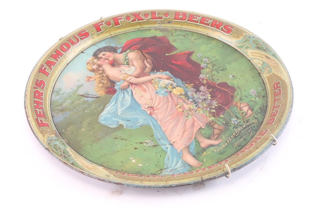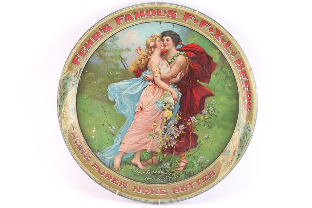 For "Fehr's Famous Beers". Frank Fehr's Brewing Co. Incorp., Louisville, Kentucky. Slogan: "None Purer, None Better" at bottom edge. Romantic lady and gent in ancient costume at center. Condition is rated at 6-7 with scratches, marks and flecks of missing paint.