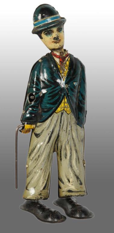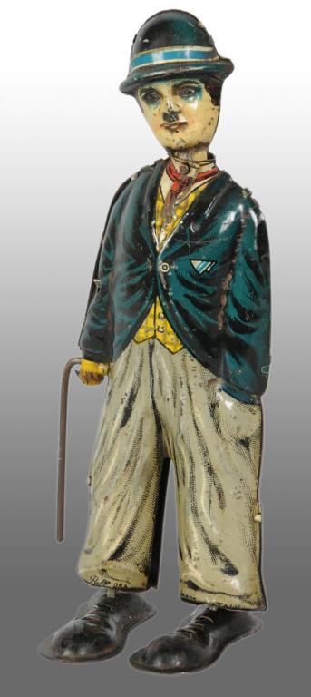 Italian. Circa 1920. Made by Bell. Very rare. This is one of three known litho variations of the German toy, see auction lot #1337, that were made in Italy. This Italian toy is the one that most closely resembles the German original. Working. Marked “Made in Italy Bell” on bottom of both front pant legs. Walks forward on comically oversized shoes with spinning cane. The walking mechanism is a very early attempt to make the movement appear more natural and realistic. Moderate overall wear. Collection of Carl Lobel. Condition (Very Good - Excellent). Size 6 - 3/4" T.