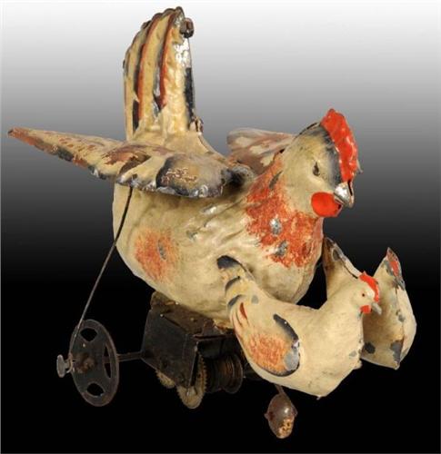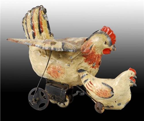 Description German. Working. Handpainted toy depicting chicken walking behind two chicks. Large chicken has articulated wings that move when wound. Some pitting to bare metal where paint is missing with moderate overall scratching and paint loss. Condition (Very Good). Size 7" L.