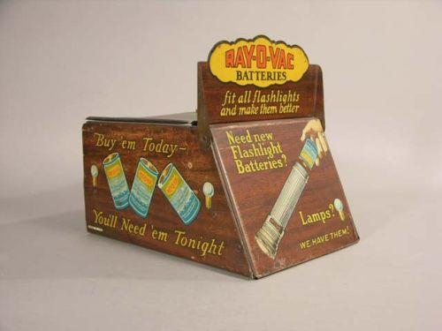 Tin store display case for Ray-O-Vac batteries, 7 1/2" x 11 1/4" x 9 1/2". Minor scuff marks.
