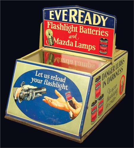 Tin Eveready Flash Light/Madza Lamp Store Display, with battery tester in back. Excellent condition. 9 X 11 X 12 inches.