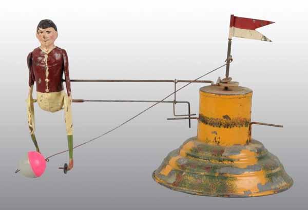 Description German. Working. When wound, boy spins around base while kicking celluloid ball. Moderate overall paint loss and wear to base with replaced flag and some repaint to figure. Condition (Very Good). Size 12" L.
