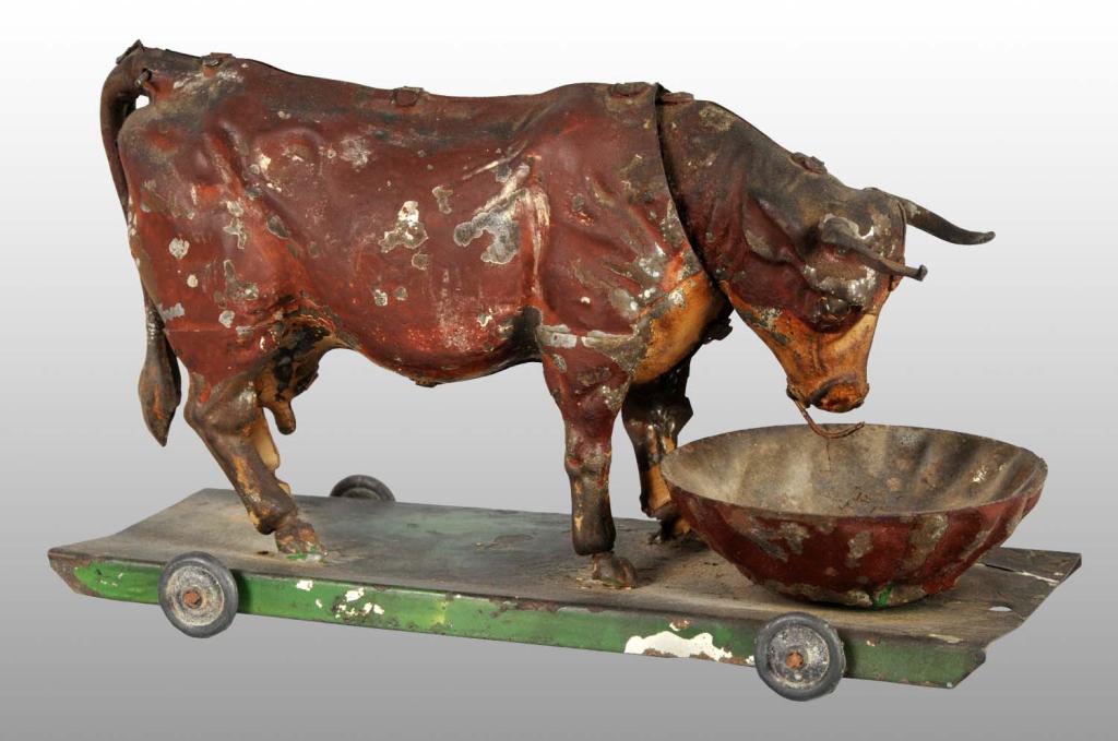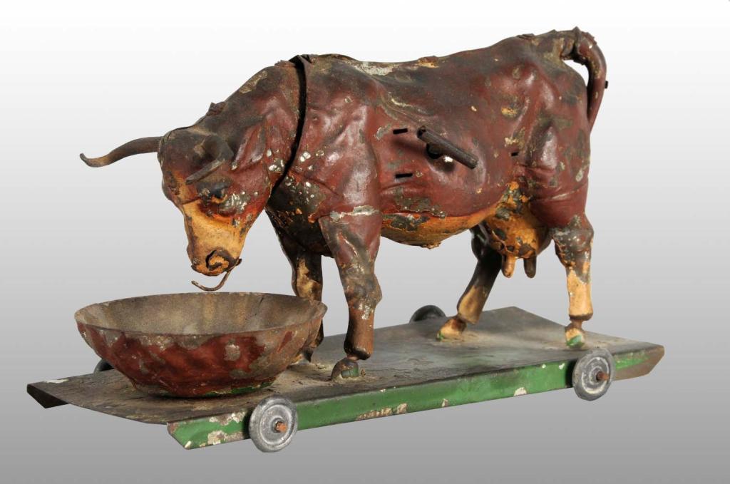 Description German. Working. When wound, bull's head and tail go up and down while feeding out of a bowl. Bull is attached to a platform. Moderate overall paint loss and wear. Condition (Very Good). Size 8" L.