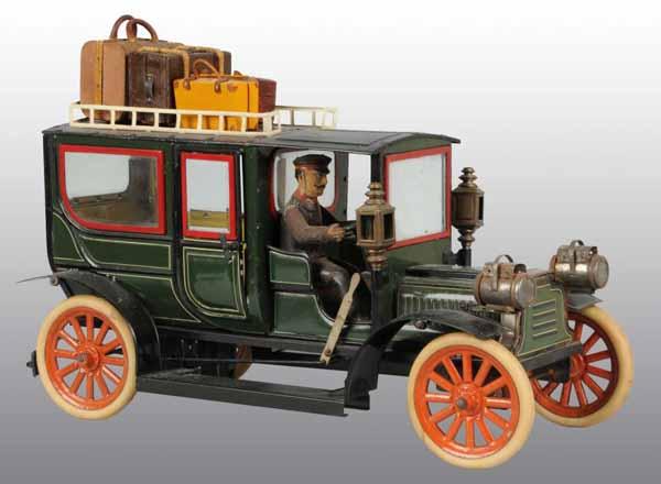 Description German. Working. Beveled glass windows with original driver and four early vintage suitcases for on top of luggage rack. Rubber tires and roof rack appear to be replaced and car is completely and professionally restored. Condition (Restored). Size 16" L.