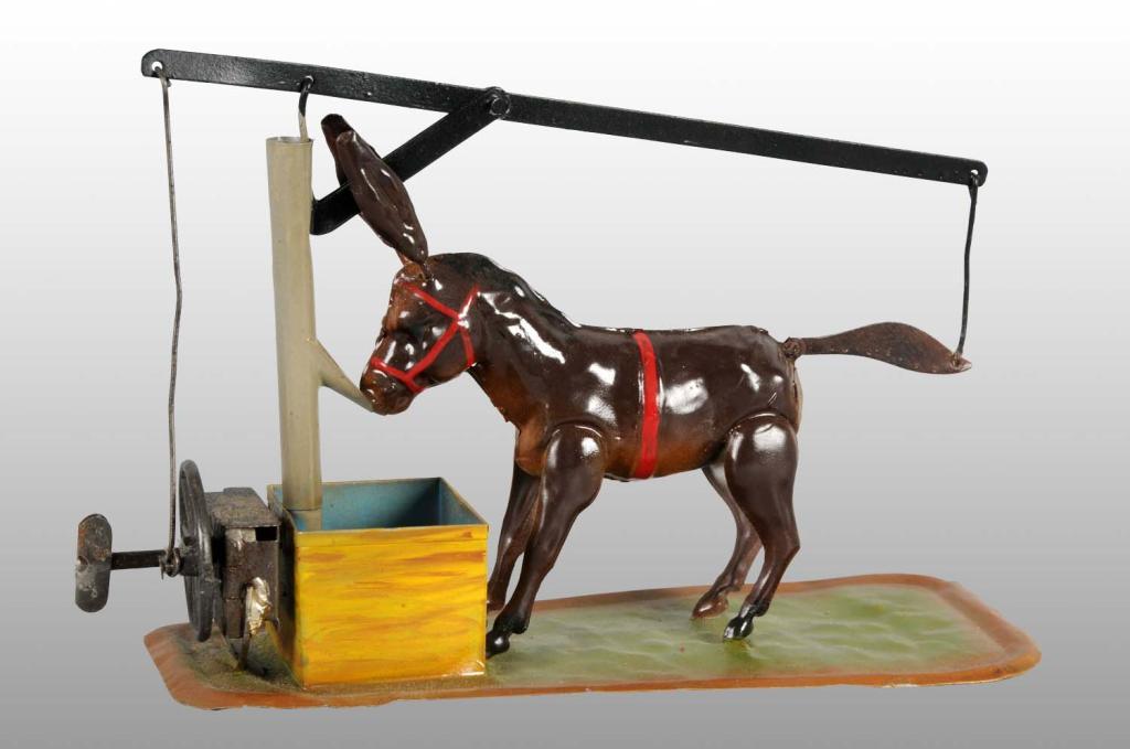 Description German. Working. When wound, donkey's tail and ears go up and down while feeding out of a trough. Some restoration to the donkey figure and one solder repair to wind-up mechanism. Condition (Very Good). Size 7" L.