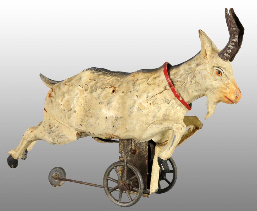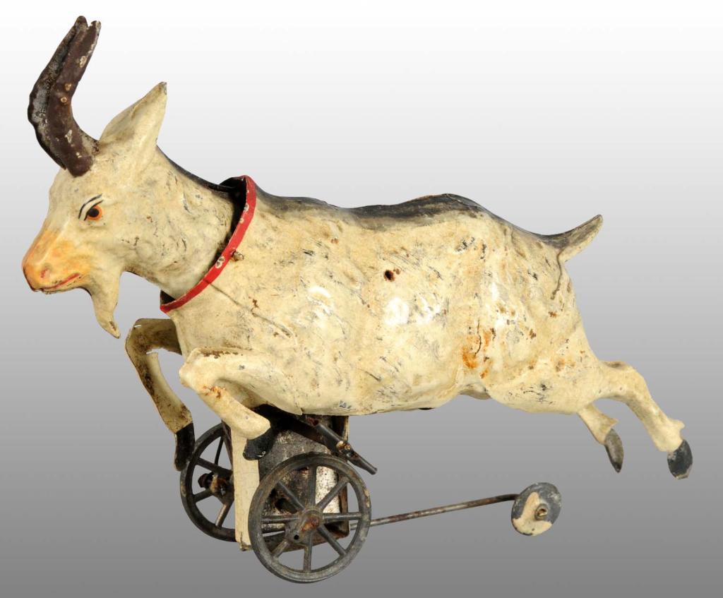 Description German. Working. When wound, goat rolls forward on three wheels on bottom, including a guide wheel, while his head goes up and down. Some minor wear. Condition (Excellent). Size 7" L.
