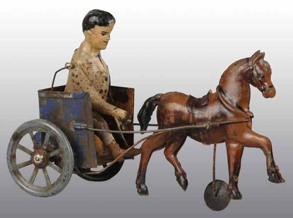 Description German. Working. When wound, toy rolls forward with aid of a single guide wheel in front. Moderate overall wear with some touchup to horse and solder repair to wheels. Condition (Very Good). Size 8" L.