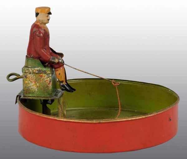 Description German. Working. When wound, arm with fishing pole moves up and down. Very unusual toy with some pitting to metal at bottom of pond and some paint touchup to figure's arms, head, and neck. Condition (Very Good). Size Figure: 4" T.