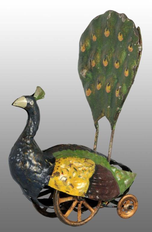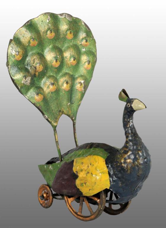 Description Probably German. Very unusual mechanism that is activated by pulling the back tail down and releasing it. Tin gold painted wheels. Some paint touchup to rear of toy, paint loss to top of tail piece, and some restoration. Condition (Very Good). Size 6" T.