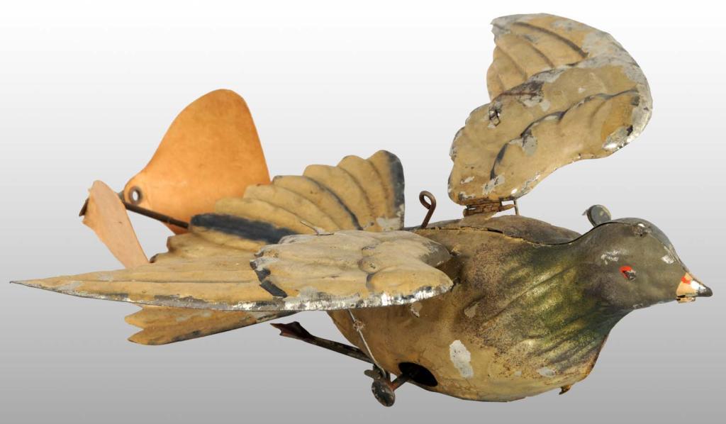 Description German. Working. When wound, wings flap up and down and two cardboard propellers spin in rear behind tail. Propellers are original but creased along with some paint loss to wings and tail. Condition (Very Good - Excellent). Size 9" L.