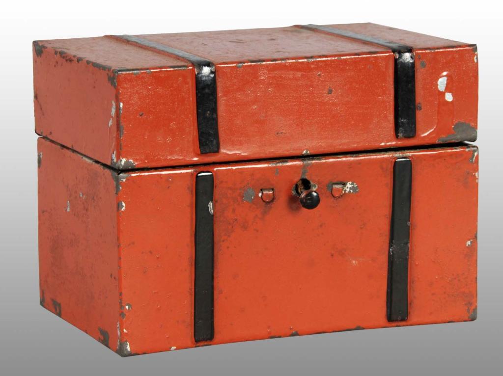 Description German. When latch is pushed in, trunk opens and when wound, bird spins around leaf pad while making chirping noise. Extremely unusual and beautiful toy with bellows on bottom to emit bird sounds. Some paint loss on inside of trunk with minor chipping. Condition (Excellent). Size Trunk: 3" x 4".