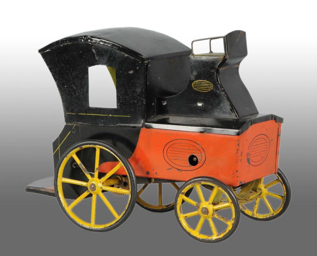 American. Circa 1915. Working. Black rubber tires over iron wheels and handpainted tin. Some moderate scratching, especially on wheels and seat but with nice scrollwork on sides. Condition (Excellent). Size 10" x 8".