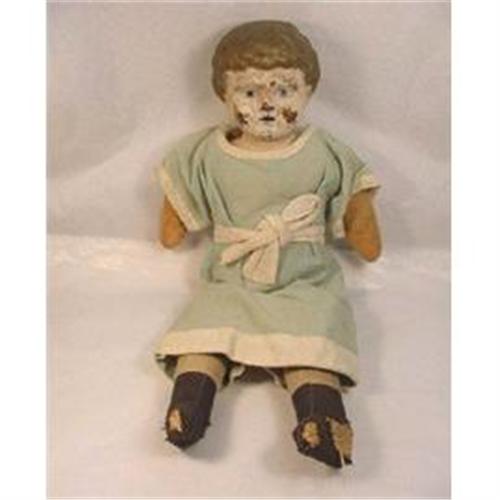 </font></strong>German Minerva tin headed doll, with straw-filled cloth body. It has a voice box which still works, and (somewhat tarnished) gold-painted hair. Open mouth, no teeth. Her arms have been replaced at some stage, and are encased in what appears to be old silk stockings. Her legs have been crudely restitched to the body - but this is easily improved. Face has wear, but personally I like it. The photos tell it all. Doll measures 37 cm long (14.1/2 inches). Circa very early 1900?s.