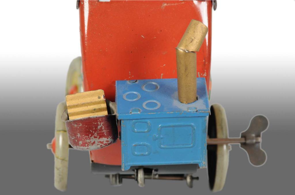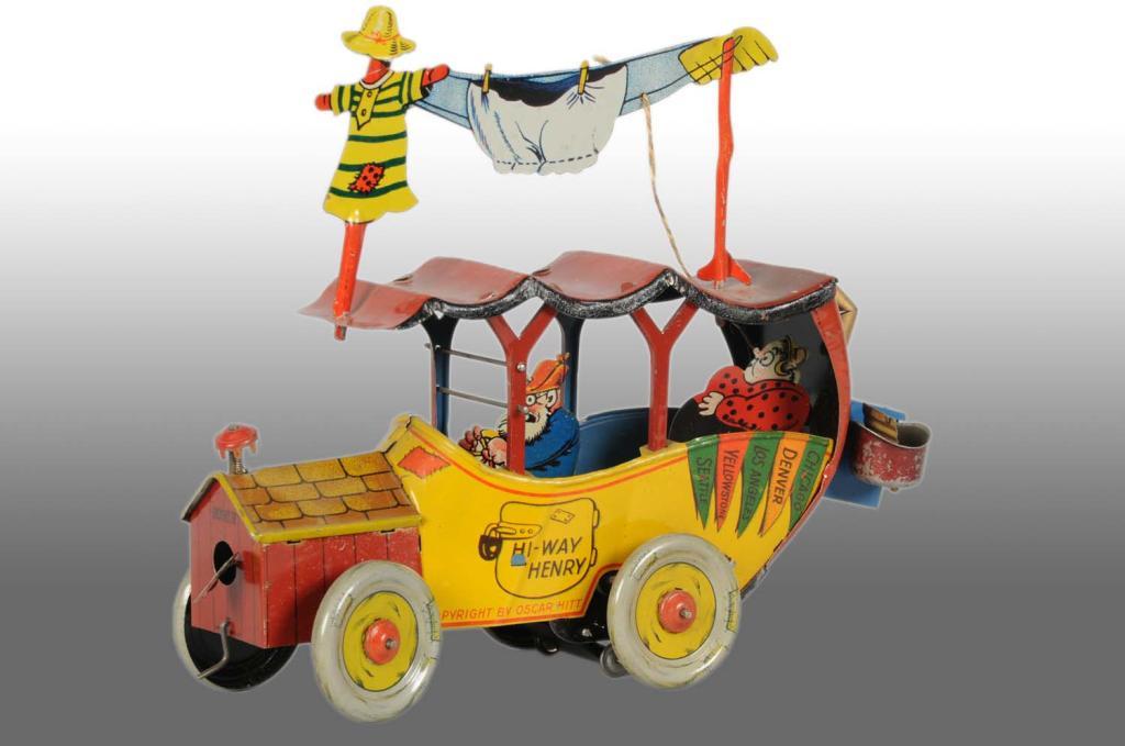German. Circa 1925. Produced by H. Fischer and Company Nuremberg, Germany. Working. Toy is marked "Copyright Oscar Hitt", who was both a comic strip artist and professional toy designer. Very complex mechanism. The Hi-Way Henry toy, designed by Oscar Hitt, represents the apex of toy design in the golden age of comic character tin. All parts are original and depict a lovely line of wash hanging out to dry on top of car with a dog on a spring emerging from his doghouse in the radiator and a lady in the backseat listening with earphones to the radio. Presumably, the driver is Henry. Minor wear, especially on roof. Collection of Carl Lobel. Condition (Excellent - Near Mint). Size 10" L.