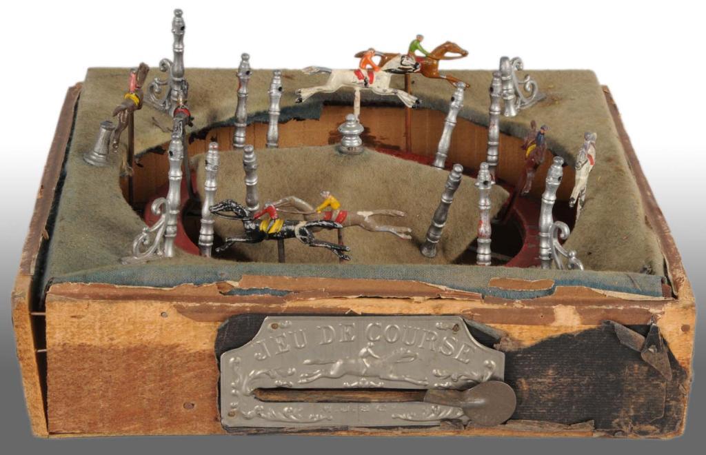 Description French. Includes eight pot-metal horses that spin around inside of track. Spinner is missing and this game does not work. Includes box with splits in wood and tears on side panels. Condition (Good - Very Good). Size 10" x 10".