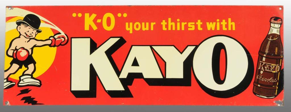 Circa 1940. Featured K-O knocking out thirst. Paint loss around mounting holes and bottom corner hole is pulled through and enlarged. Condition (7.5 - 8.0, Excellent). Size 9" x 24 - 1/2".