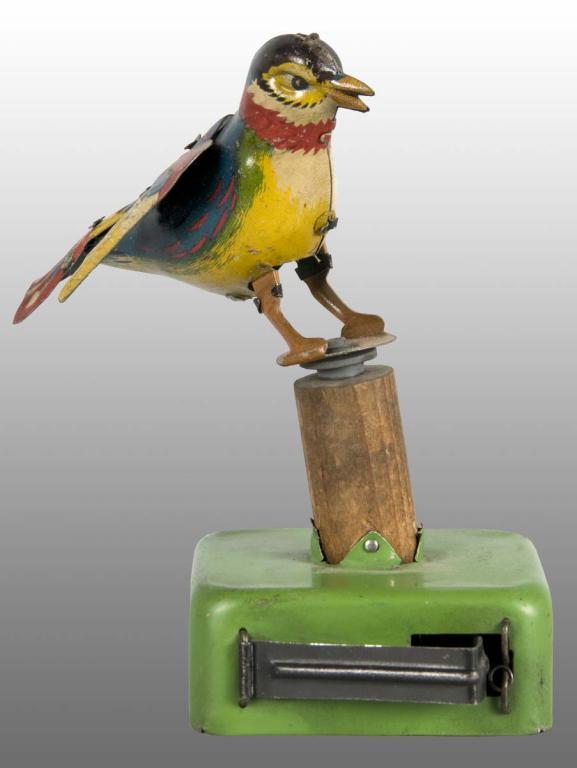 Description German. Marked "Made in Germany" on underside of belly. Beautifully colored lithography on bird resting on stump. When lever is squeezed, bird moves back and forth and emits squeaking sound. Some minor overall wear. Condition (Excellent). Size 5" T.