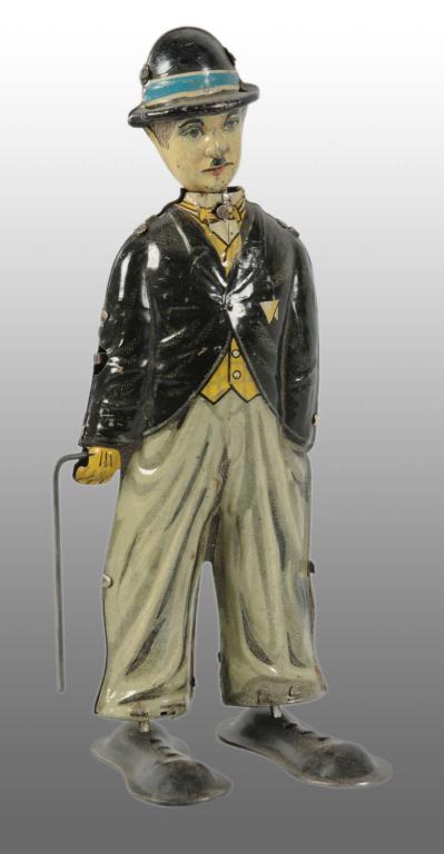 German. Circa 1920. Working. Marked “DRGM Made in Germany” on back of toy. When wound, toy walks forward with comically oversized shoes and spinning cane. This early walking mechanism is an attempt to make movement appear more natural and realistic. The tin litho face looks very much like Chaplin and the clothes are in keeping with his movie persona. Some minor wear to brim of hat. See auction lot 1338 for a made in Italy version of this toy. Collection of Carl Lobel. Condition (Excellent). Size 6 - 3/4" T.