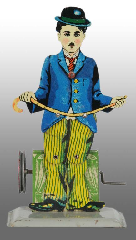 German. Circa 1920s. Marked “DRGM” on one side and “WK” on other for Wilhelm Krauss. This type of toy is often called a “Slate Dancer”, which is a Vaudeville term. Charlie dances in front of a lithographed stage and curtains. Can be operated as steam engine accessory or by cranking handle manually. Figure shows minor scratching and very little wear while base has some wear on corners. Collection of Carl Lobel. Condition (Excellent). Size 6 - 1/2" T.