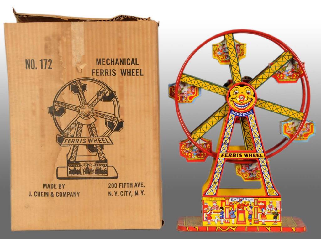 American. Working. Bell rings when toy is wound and carts go around wheel. Very little wear to toy. Includes original and complete box marked "No. 172 Mechanical Ferris Wheel" with some water staining. Condition Toy (Excellent) Box (Very Good). Size 17" T.