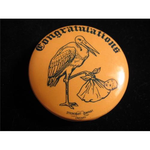UNUSUAL little bank Made by Strongart Company of Chicago and offered by The Farmers and Mechanics Bank of Ann Arbor, Michigan to attract new accounts. It features a stork holding a baby in a blanket and "Congratulations!" on one side, and "$1.00 Opens an Account. We loan you this little Bank to encourage Thrift. It holds $3.00 in dimes. We will open it for deposit as often as you bring it in. We have the key." It is lithographed tin; in near mint condition.