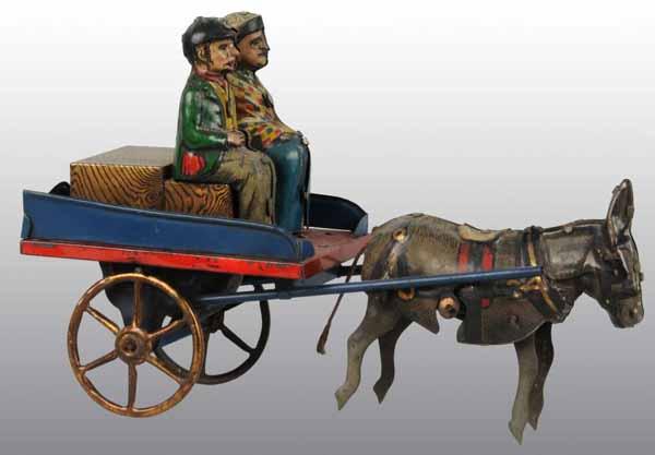 Description German. Working. Unmarked but probably Hess. Includes beautiful three dimensional tin litho figures along with gold wash wheels. Some wear around edges of base and wear to one wheel. Condition (Excellent). Size 8" L.