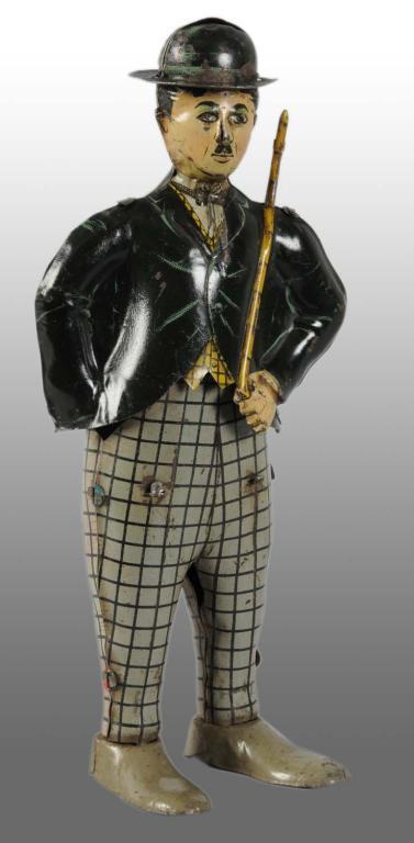 Italian. Circa 1920. Rare. Working. Marked “INGAP” in back above shoe. When wound, toy waddles forward with side-to-side motion and holds cane up over shoulder, more like a sword or rifle than a cane. Moderate overall wear, especially above brim of hat in front. Collection of Carl Lobel. Condition (Very Good - Excellent). Size 7 - 1/2" T.