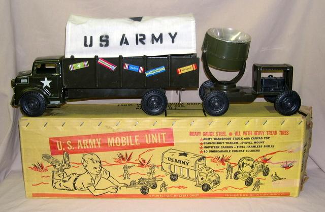 Looks like a Marx toy, Toy is near mint, has some stickers added to the side that came originally with the toy, box is complete and just shows some wear, overall a nice looking set