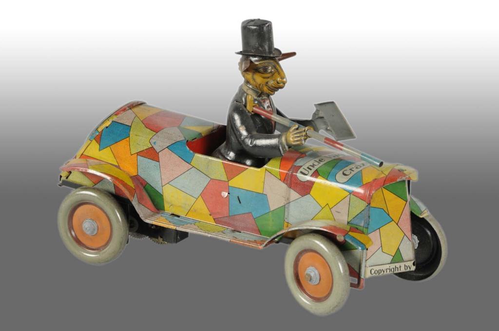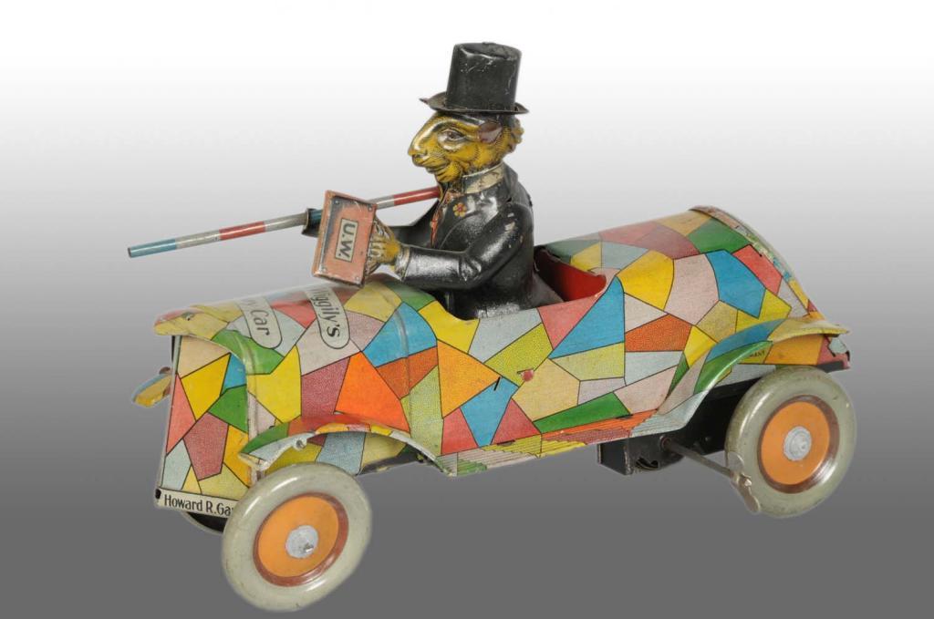 German. Early 1920s. Working. Imaginative design, impressive size & beautiful lithography. Front of car marked "Copyright Howard Garis", the creator of the Uncle Wiggily character, and rear of car marked "B&S 890 New Jersey". All original parts with moderate overall wear. Collection of Carl Lobel. Condition (Very Good - Excellent). Size 9 - 1/2" x 6 - 1/2".