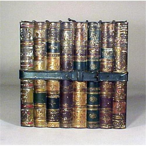 Here is something absolutely wonderful ? an advertising tin. It is marked Huntley & Palmers Biscuits Reading & London. It is a strapped group of leather bound books in all the classics ? History of London, Pilgrims Progress, Burns, Pickwick Papers, Robinson Crusoe, Gulliver?s Travels, Self Help and Shakespeare. The lithography is exceptional and the condition is quite spectacular. I believe this advertising tin dates from the 1880?s -1890?s. I?m just in loved with this box! If you have taken a look at the other items in our online shop you will see that another one of our passions is books which explains why I felt that this piece was quite irresistible. This tin even has marbleized page edges just like you would find on real Victorian leather bound books. It measures 6 ½? x 6 ½? x 4 ½?.