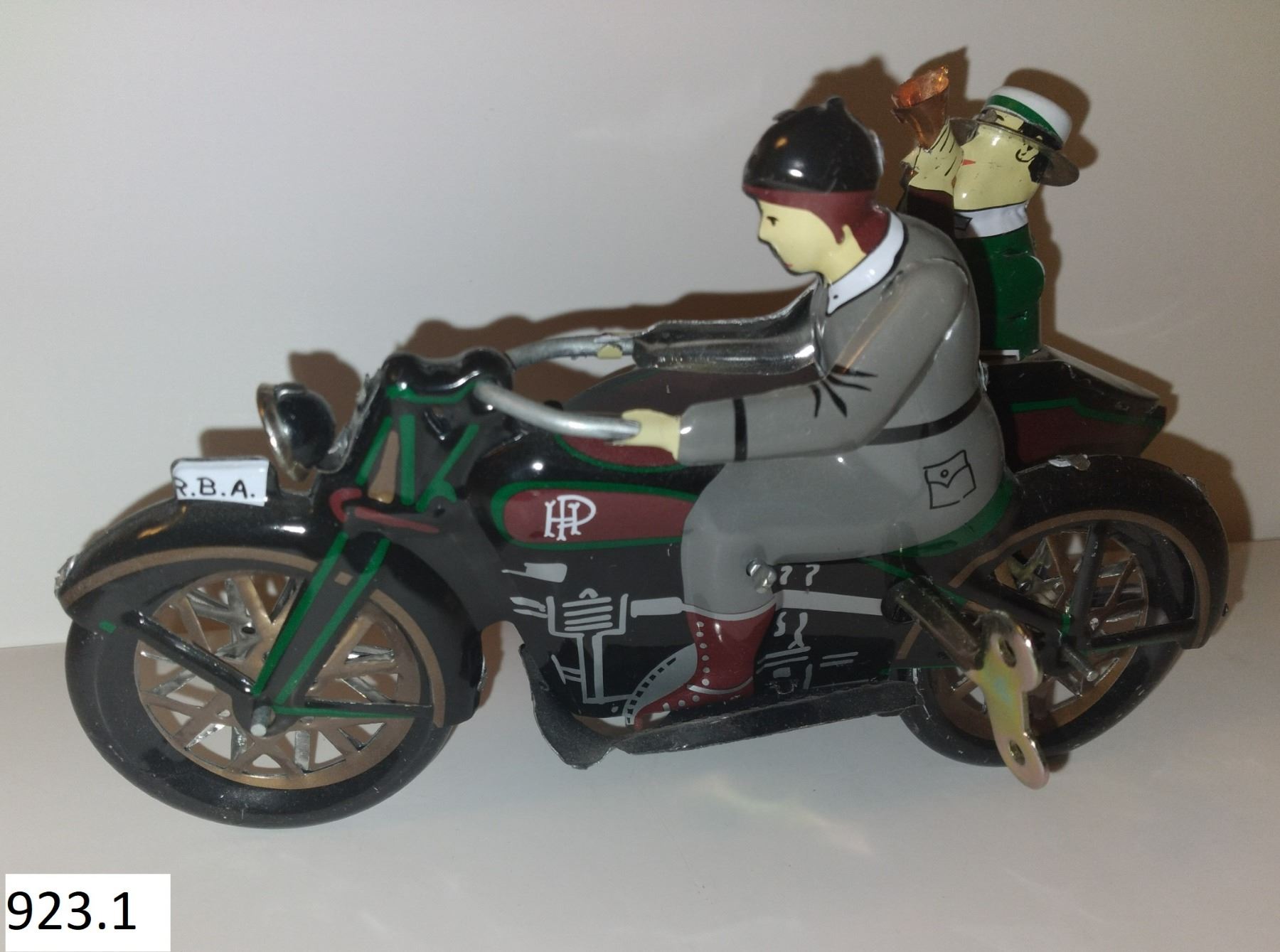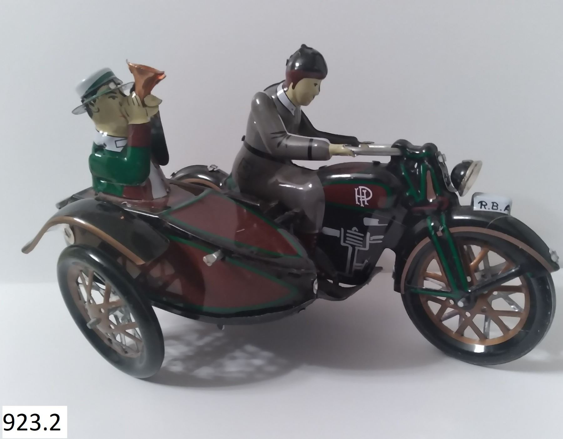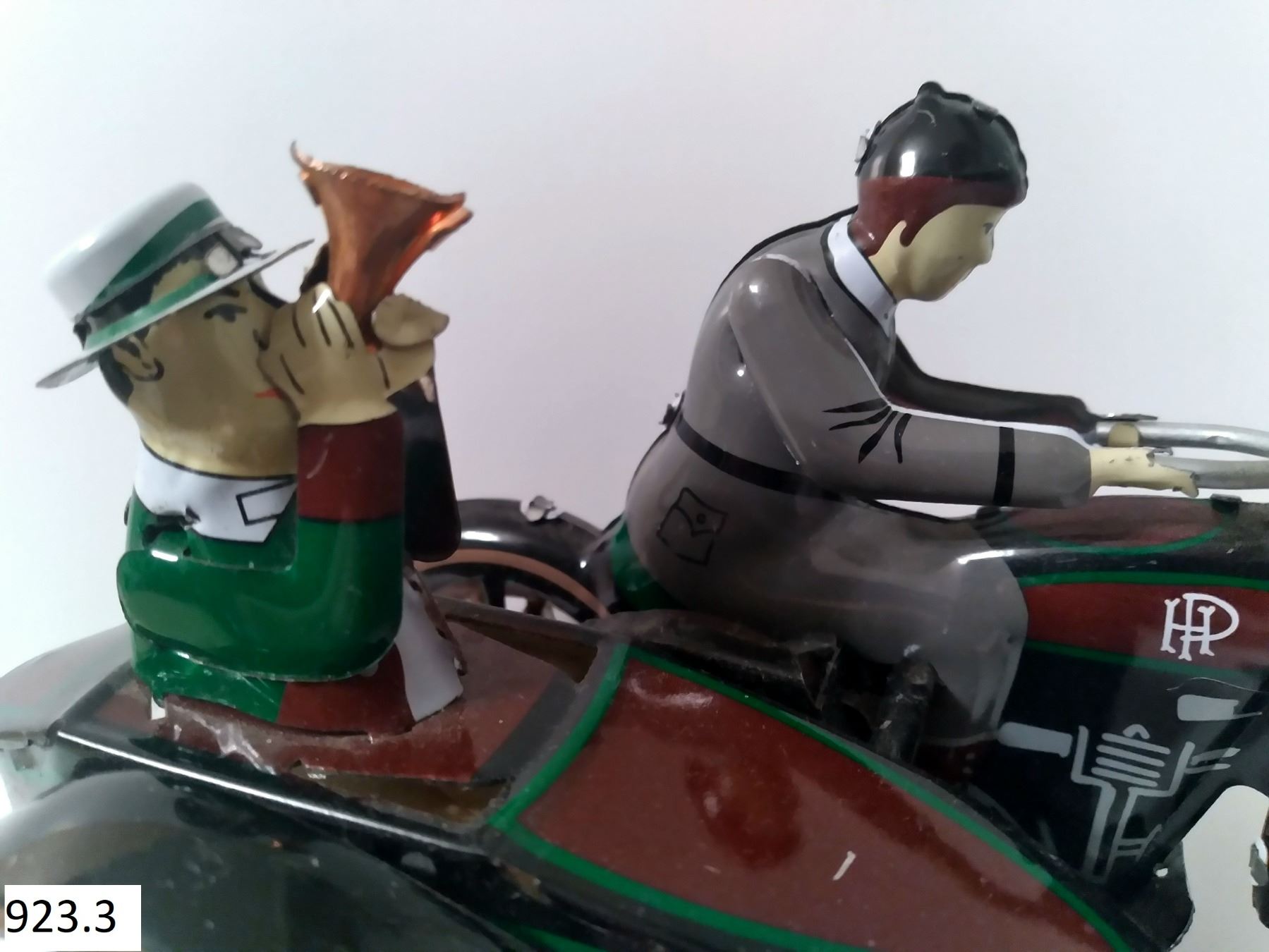 Tin Lithographed windup 1920s Motorcycle with Sidecar, older reproduction, with key.