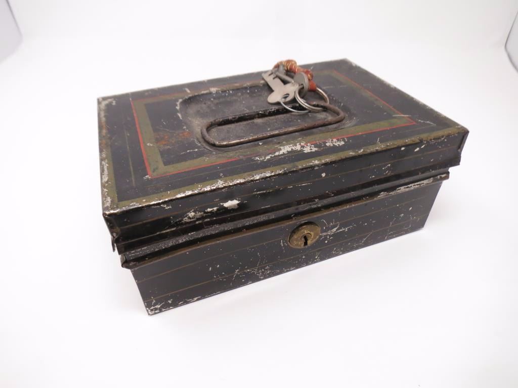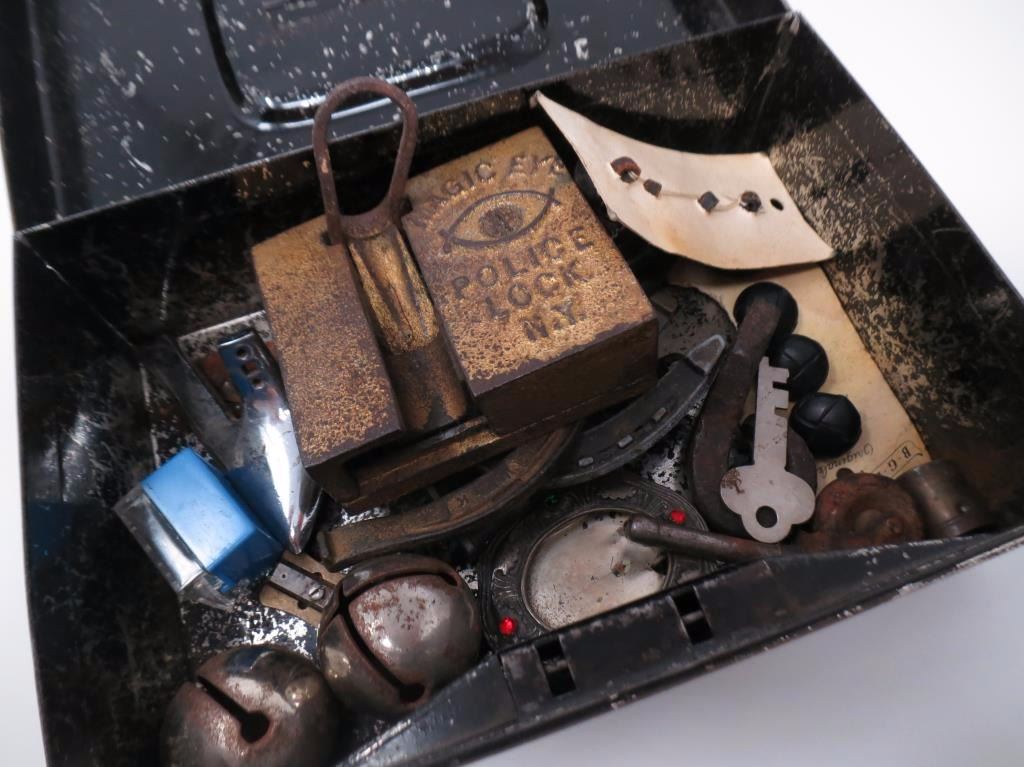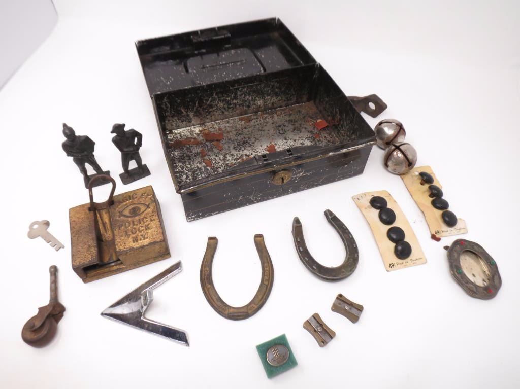 Including old hardware, cast iron soldiers, horseshoe buckle, buttons and an iron "magic eye police lock (?) " Two keys to the box.