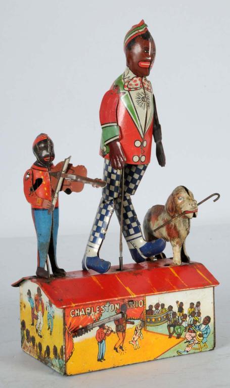Description American. When wound, middle figure dances while figure on right plays violin and dog goes up and down with cane in mouth. Nicely lithographed figures around base with moderate overall wear and some pitting to the metal, especially on roof. Condition (Very Good). Size 8" T.