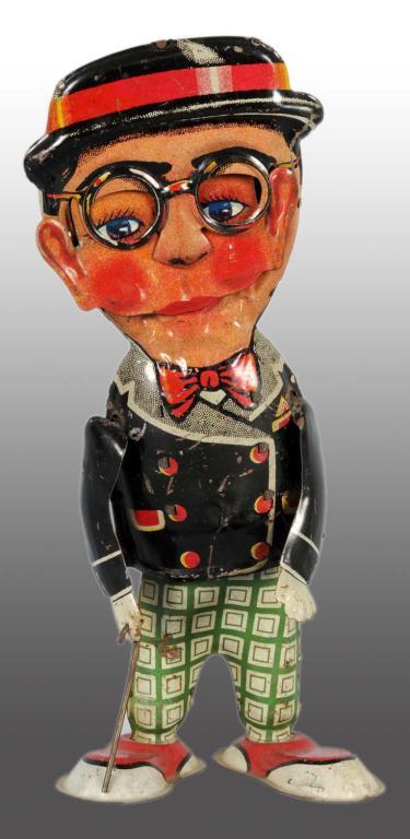Description American. Working. When wound, toy  waddles back and forth while eyes blink back and  forth. Original arms and cane. Moderate overall  scratching and wear throughout. Condition (Very Good). Size 11" T.