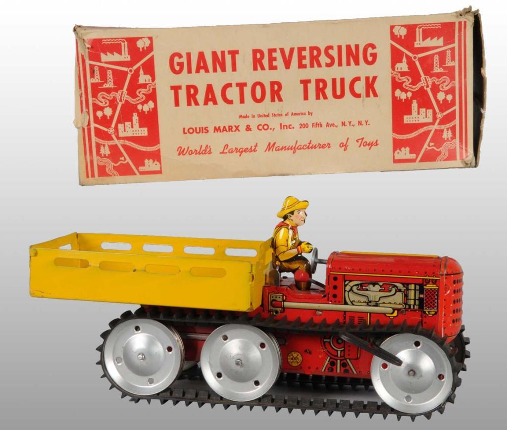 Description Working. Original treads and driver with minor scratching and wear. Includes original box with tears and creasing throughout and one missing inner flap. Condition Toy (Excellent) Box (Good - Very Good). Size 14".