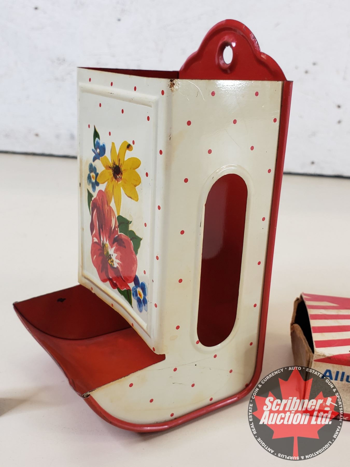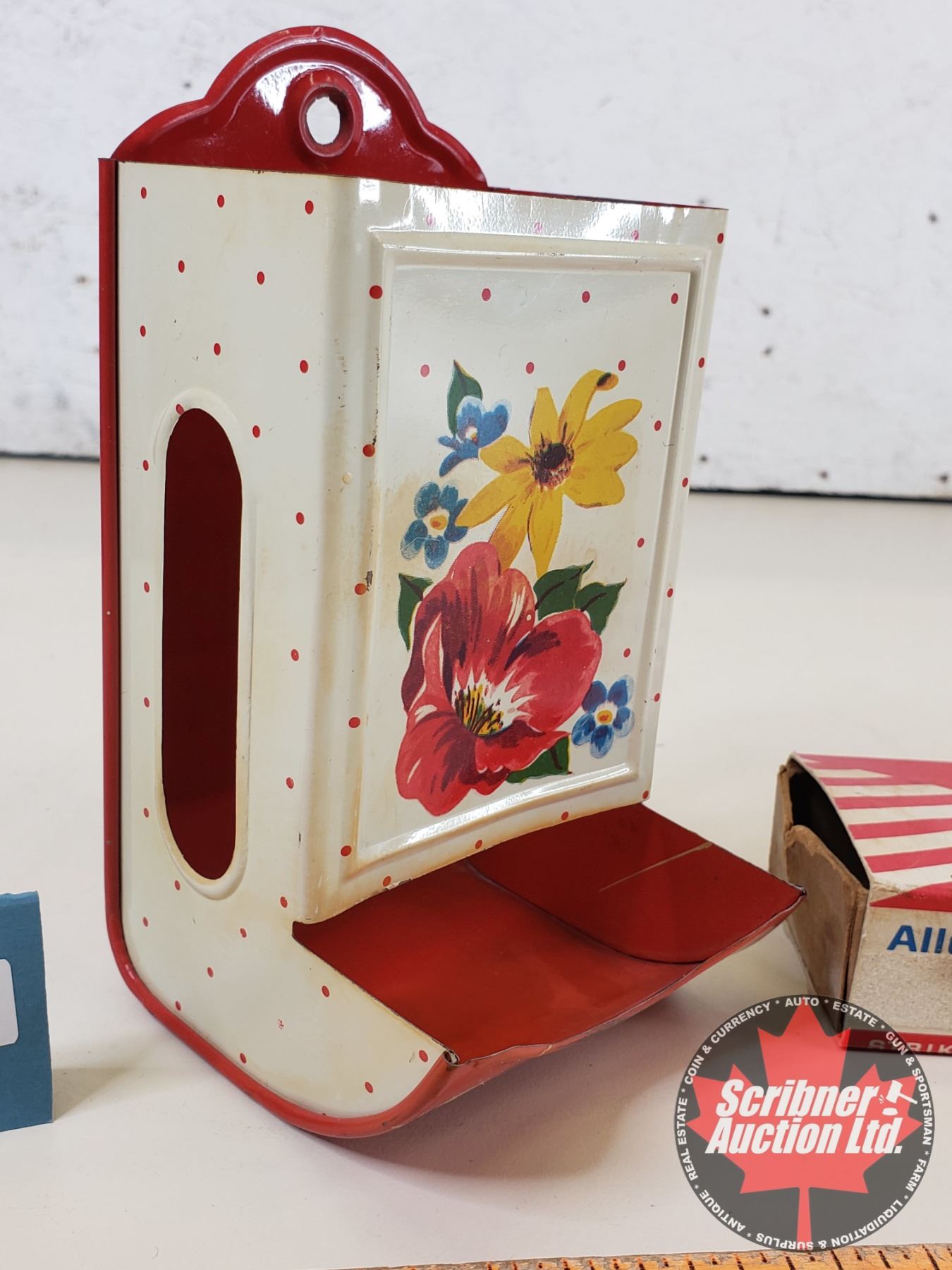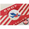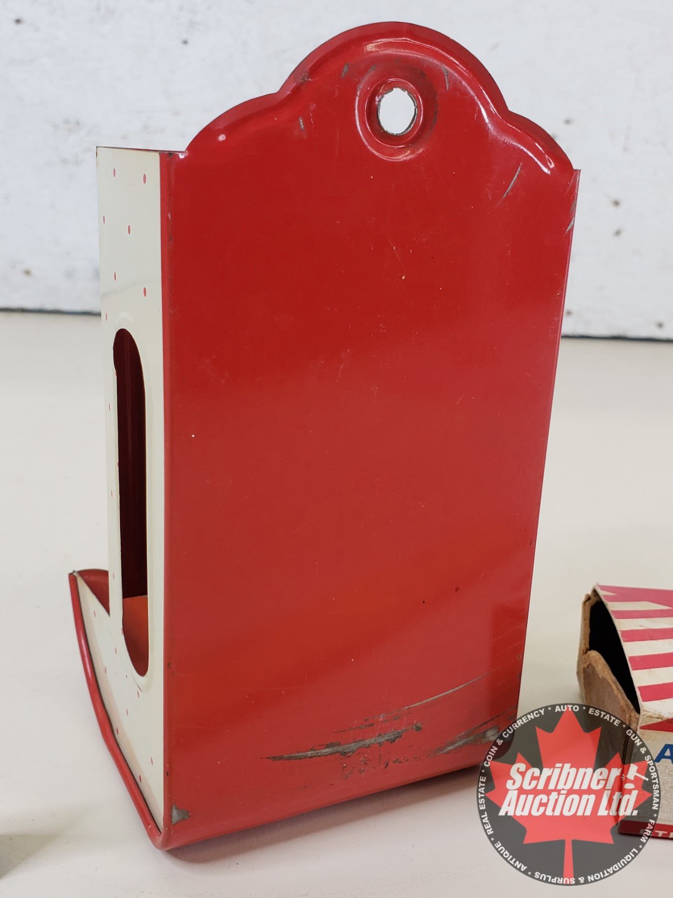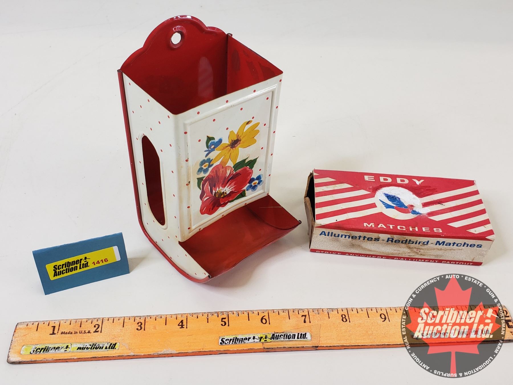 Tin Match Box Holder (Red/Whit) (Floral Motif) with "EDDY" Empty Match Box (6"H x 3"W x 3-1/4"D) (SEE PICS!)
