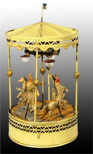 Description German. Working. Includes three original hanging globes from inside canopy. Riders are made of paper mache. Plays plink-plink music when horses go around carousel. Moderate paint chipping and wear on base. Condition (Very Good). Size 18" T.