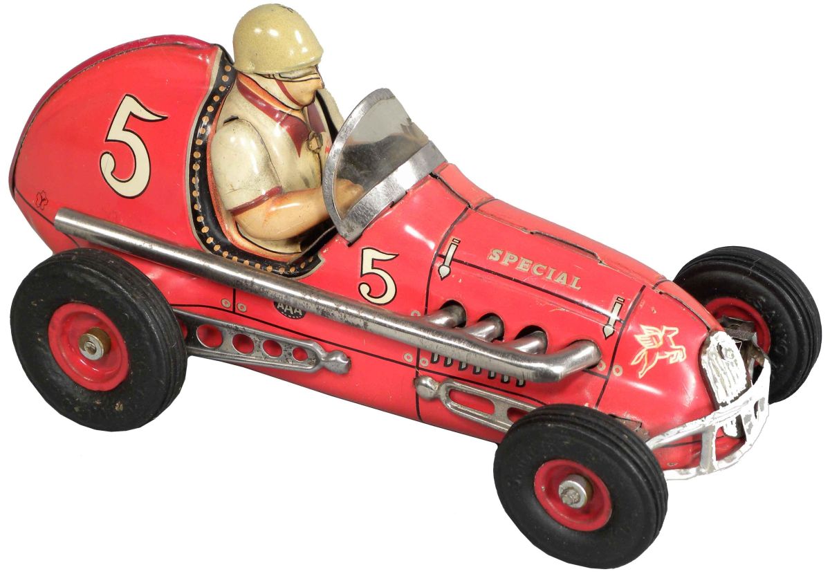Tin Midget Racer Toy Car, friction powered. Made in Japan. Special 5, E.T. Company. Mobile Oil and AAA Sponsorship. Excellent condition. 7 inches long.