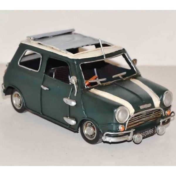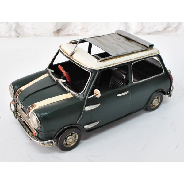 Decorate any table, desk, or shelf in sporty fashion with Our Rustic 1960 Mini Copper car. Featuring a rustic iron frame, this charming vintage Classic Car includes fine detail. The black metal seat is finished in natural colors. Dimensions: approx (H X W): 4 X 9 Inches.