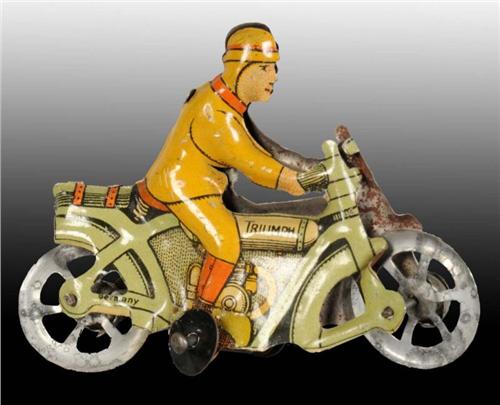 Description German. Includes original training wheels. Marked "Triumph" on gas tank and "Germany" on rear. Beautiful lithography. Missing handlebars and metal needs to be straightened out. Very little wear to litho. Condition (Very Good). Size 2 - 1/2" L.