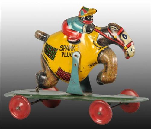 Description 1934 King Featured Syndicate. Marked "Spark Plug" on both sides. Original wheels. When pushed, horse is articulated and goes up and down. Moderate wear. Condition (Very Good - Excellent). Size 9" x 7".