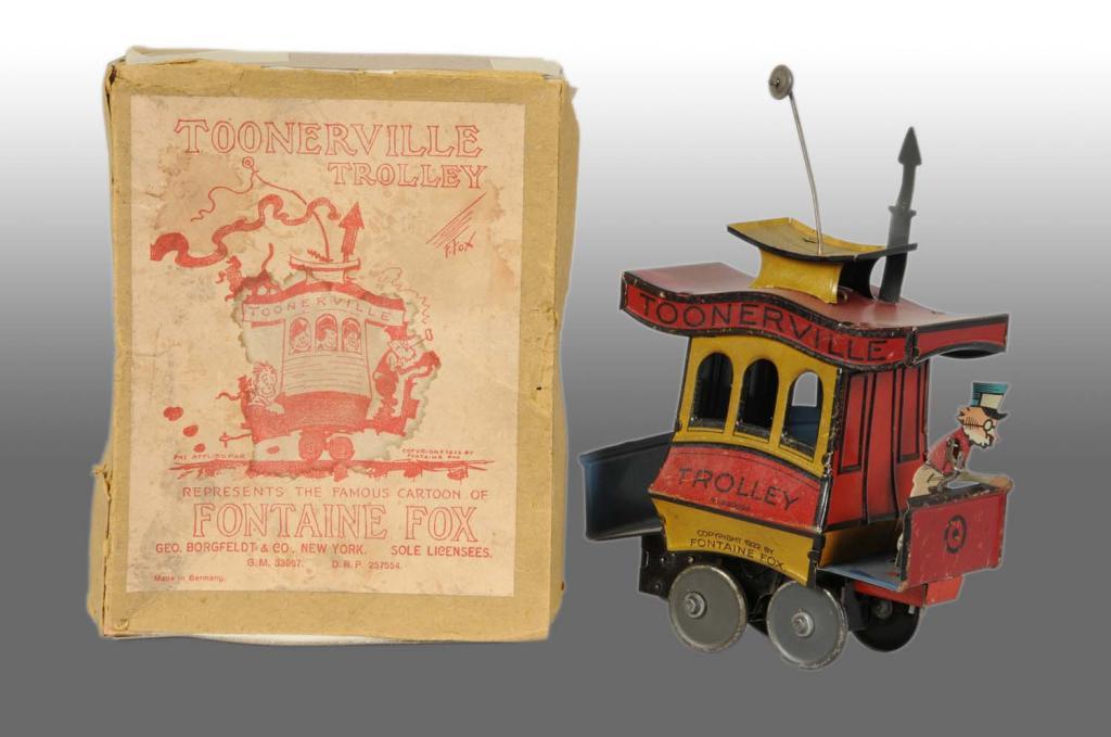 With box. German. Circa 1920s. By H. Fischer and Company Nuremberg, Germany. Working. Early example of an eccentric wind-up mechanism, possibly the first. The toy was designed by the creator of the comic strip, Fontaine Fox. Marked "Copyright 1922 Fontaine Fox" and "Toonerville Trolley" on both sides. Original stack and pole with minimal to moderate wear. Includes scarce, original box with paper label and marked "George Borgfeldt & Co." Box has some tears and staining on label with two repaired side aprons on lid. Collection of Carl Lobel. Condition Toy (Excellent) Box (Very Good). Size 8" T.