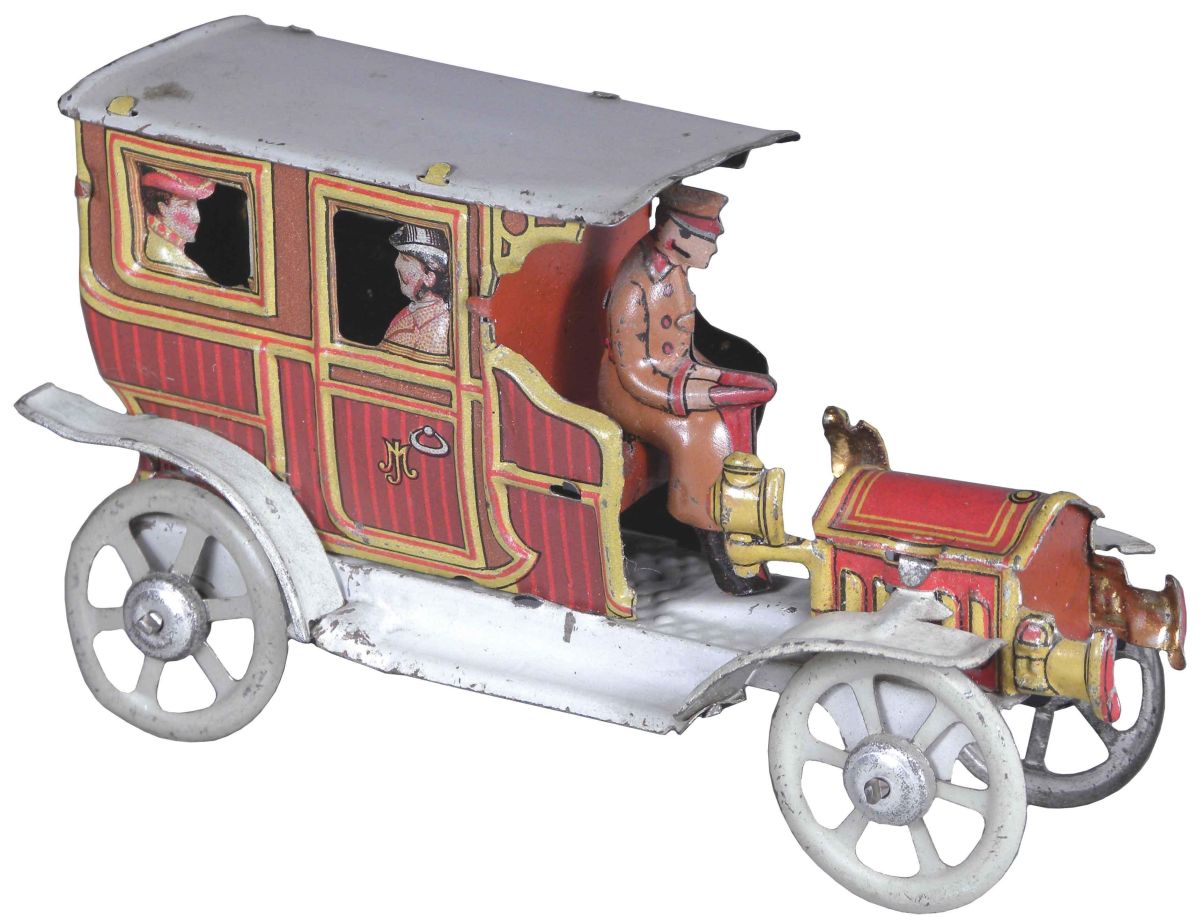 Tin Penny Toy Automobile with chaufeur and four passengers. Some tiny chips on paint otherwise very good condition. 4 1/4 inches long. Start Price $100