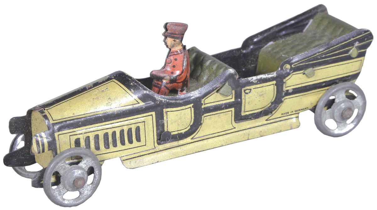 Tin Penny Toy Automobile with driver. Made in Germany. Some slight rubs to pain otherwise very good condition. 5 inches long. Start Price $100