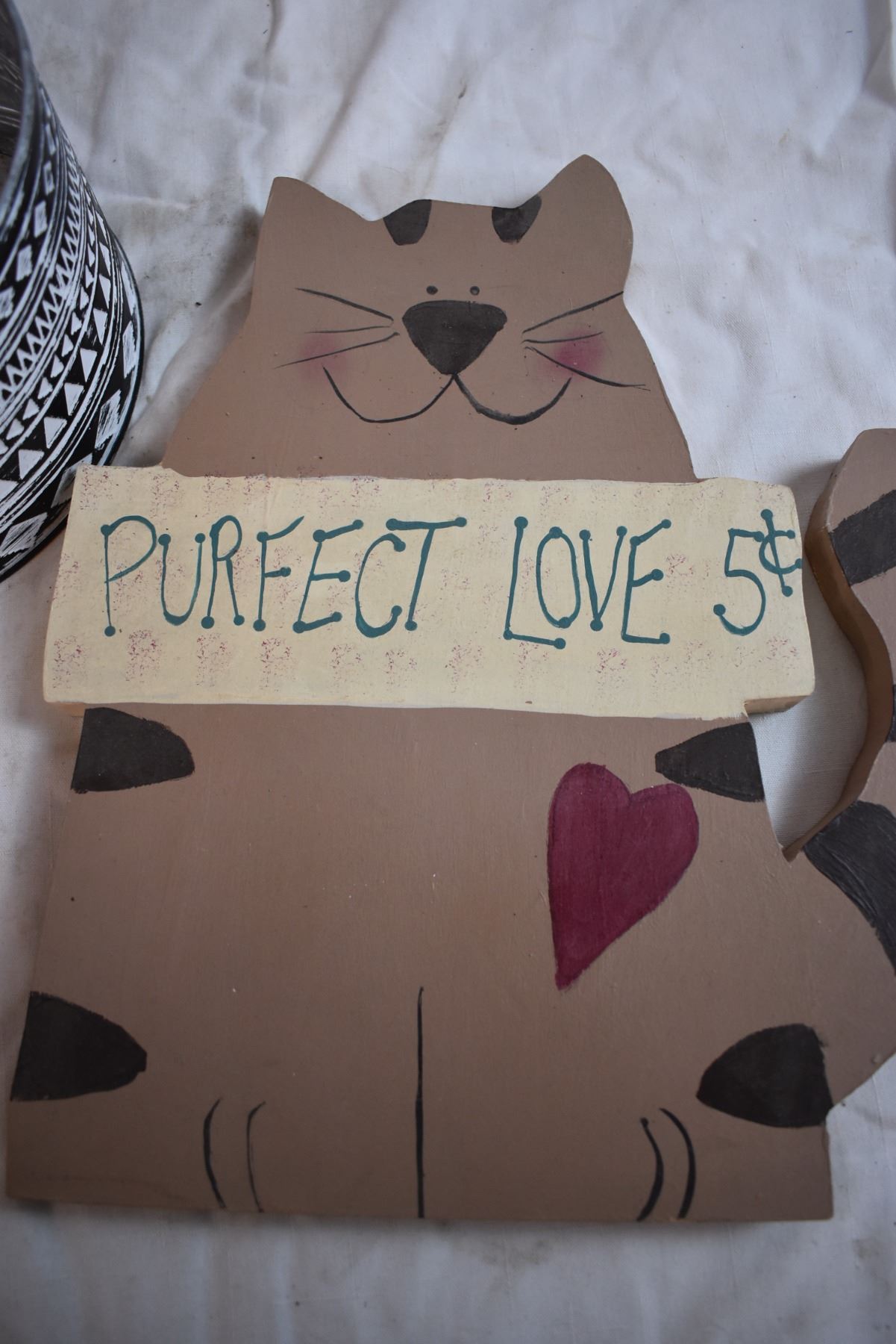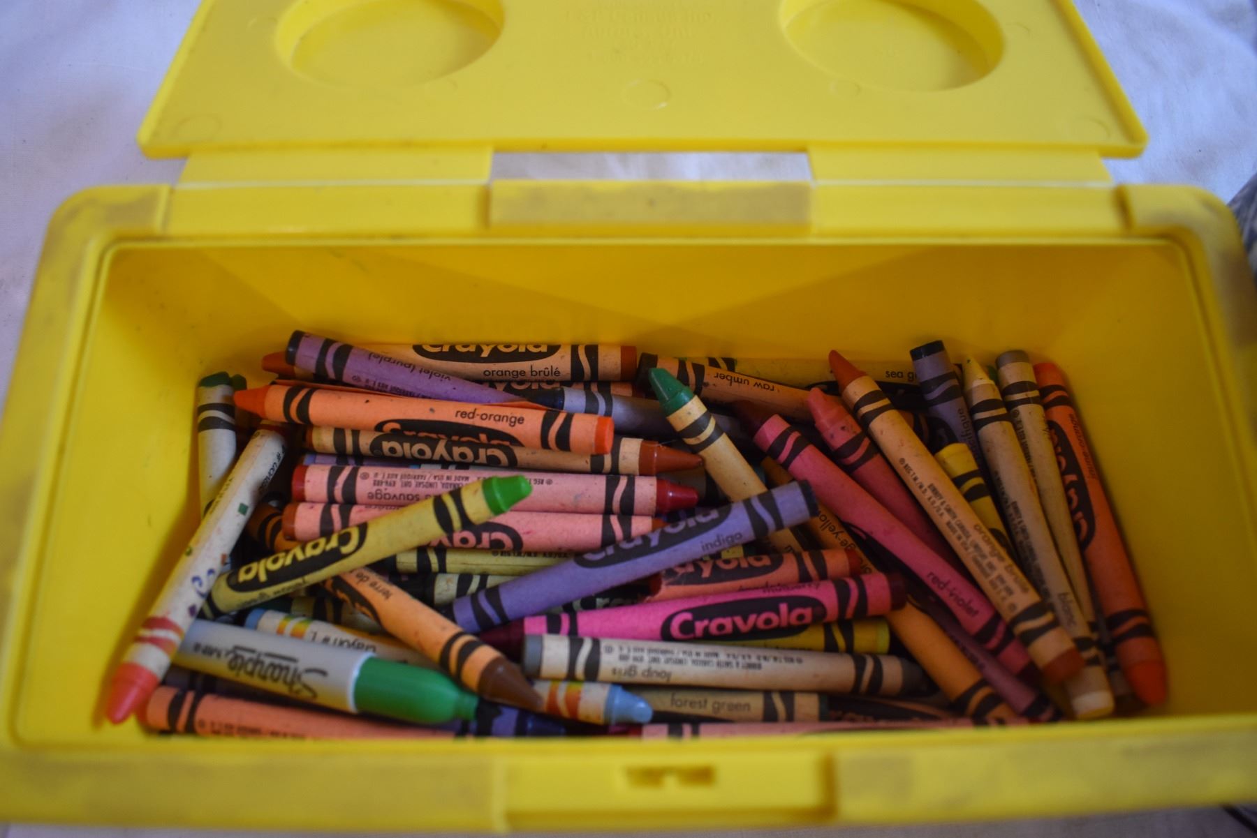 Tin Planter, Box of Crayons, and Wooden Ornaments
