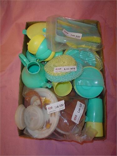 Tray of Assorted Tin & Plastic, Blue, Yellow & Brown Play Plates, Cups, Utensils & More