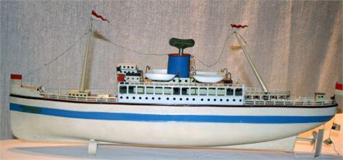 Toy tin plate ocean liner by Fleischmann. Measures 18". Key wind. Great condition.